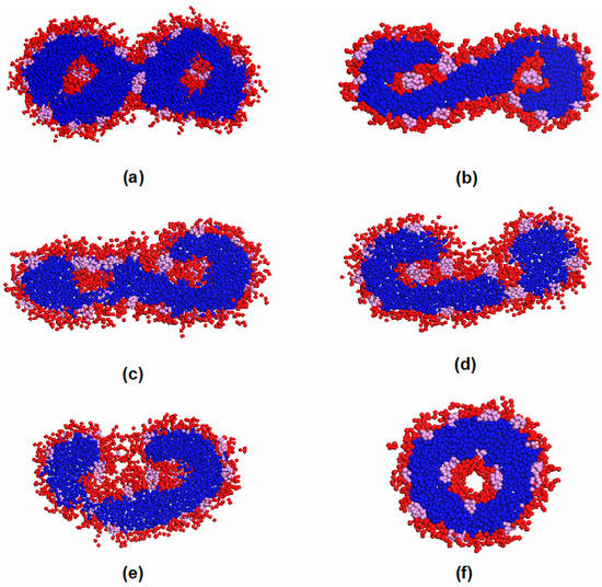 The development of polymerization techniques has increased the variety of polymer chain architectures (e.g., linear, star, graft, and dendrimer) as well as the number of building blocks (e.g., ABC triblock), which lead to the formation of polymer vesicles with complex structures, e.g., nanostructured vesicles, patchy vesicles, multilayer vesicles, and Janus dendrimersomes [6,12,13,24,25,26]. The complexity of the vesicle structure could lead to a different fusion path. For example, the fusion process for multilamellar vesicles (MLVs) was found to be layer-by-layer, which starts at the outmost layer and ends at the innermost one. Nevertheless, little attention has been paid to the fusion of vesicles with complex structures. Since many functions of vesicles are related to their fusion behavior [23], investigating the fusion process can help us understand the relationship between structures and the design of potential applications [13,27].