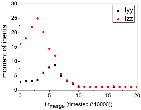 Shape characterization by moment of inertia after merging. , , and are the principal moments of inertia of the aggregate.
