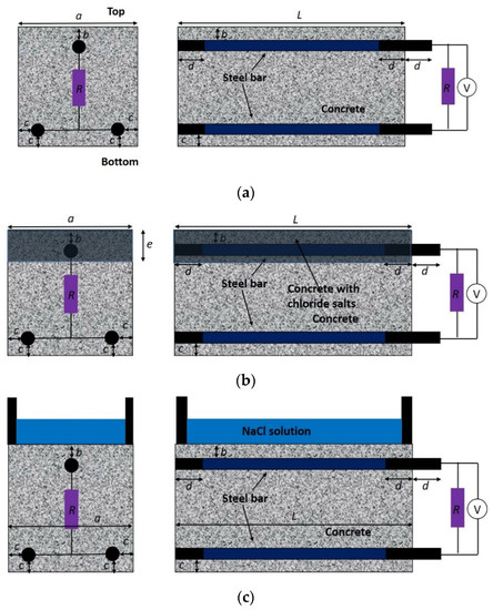Configuration of modified ASTM G109 specimens to simulate the macrocell corrosion in concrete structure exposed to (a) accelerated carbonation; (b) internally admixed chloride; (c) cyclic drying–wetting chloride penetration. (a = 150 mm, b = 10 mm, c = 15 mm, L = 250 mm, d = 25 mm, and e = 30 mm).