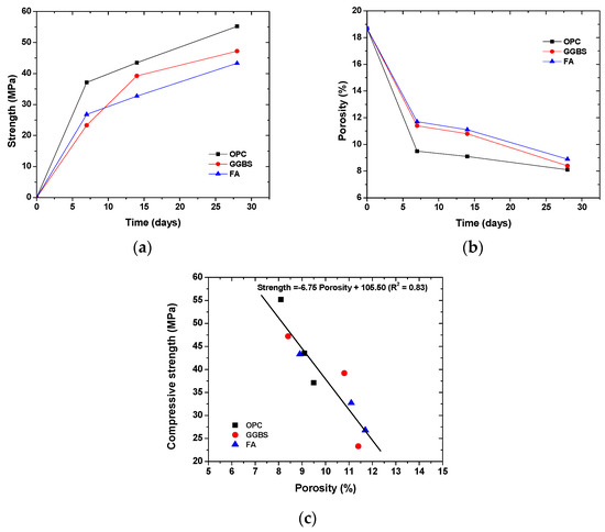 Strength and porosity in concrete: (a) time-dependent evolution of compressive strength; (b) time-dependent evolution of porosity (the initial porosity, i.e., the porosity at 0 day was calculated based on the mix proportion); (c) correlation between compressive strength and porosity.