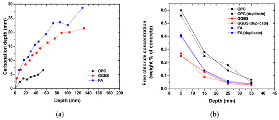 Figure 3 shows the time-dependent evolution of the carbonation depth and free chloride concentration profiles in concrete with various binder types. As expected, the carbonation depth increased over time but at a much faster rate for concrete with slag and fly ash incorporation [40]. The carbonation depth of slag and fly ash concrete was up to 6 times higher than that of OPC concrete. The reduction in the carbonation resistance in slag and fly ash concrete is attributed to the low-calcium content in the cementitious binder due to the dilution effects and pozzolanic reaction. The reactive aluminosilicate component in the glassy structure of slag and fly ash can react with the portlandite, thus decreasing the carbonation resistance [40]. In addition to the formed calcium-silicate-hydrate due to pozzolanic reactions, the hydration of slag and fly ash can result in an AFm-type phase and alumina-modified calcium-silicate-hydrate formation. The formed AFm phase, a type of Ca–Al-layered double hydroxide, can undergo an ionic exchange reaction between the hydroxide and chloride ions, thus increasing the chloride binding capacity [41,42,43]. Therefore, it is reasonable to observe the improved chloride resistance in concrete incorporated with slag and fly ash. Although the porosity was slightly reduced in concrete due to slag and fly ash incorporation, the more refined pore structure in slag and fly ash concrete could contribute to a reduction in chloride penetration [37,43,44]. As listed in Table 2, the pH value measured in concrete with slag and fly ash was slightly smaller than that of OPC concrete, which was attributed to the enhanced alkali binding in alumina-modified calcium-silicate-hydrate [45]. However, the pH at the concrete surface after carbonation was similar for all concrete groups.