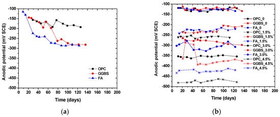 It can be seen that, regardless of the simulated environments, the initial corrosion potential of the anode steel was around −120 mV (SCE). Depending on the exposure condition and binder types, the corrosion potential dropped and corrosion current increased since the depassivation of steel occurred. However, the extent of the potential drop and the corrosion current increase was dependent on the simulated environments. For example, although the potential dropped significantly for the concrete with more than 1.5% salt contamination, its corrosion current density was about 50% lower than the concrete under external chloride penetration at a similar chloride content. It suggests that drying–wetting cycles can exacerbate corrosion development in concrete, probably due to the presence of microcell corrosion in the top layer of steel, in addition to the induced macrocell corrosion. In contrast, the internal chloride admixing at the top layer of steel ensured full-scale depassivation and thus prevented the formation of additional cathode zones in the top steel. In addition, by comparing the concrete exposed to carbonation and chloride penetration, it can be seen that at the same level of corrosion potentials, the current rate was significantly higher in the case of chloride-induced corrosion. The finding suggests that the correlation between corrosion potential and corrosion current density is dependent on exposure conditions.