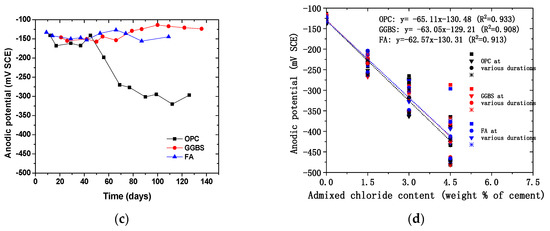 Time-dependent evolution of corrosion potential in the top steel (anode) embedded in concrete exposed to (a) accelerated carbonation; (b) chloride contamination; (c) chloride penetration; (d) the correlation between admixed chloride content and the corrosion potentials.