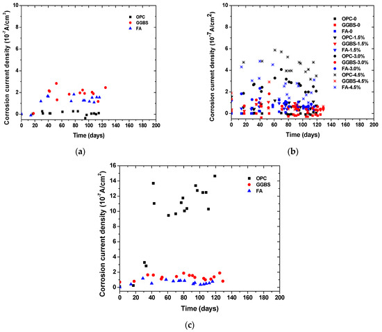 In the case of internally admixing chloride, it can be seen that the corrosion potential was significantly dependent on the amount of admixed chloride salts, irrespective of binder types. The anodic potential for the group without admixing chloride ions remained at about −120 mV, indicating that the steel was not corroded. The correlation between the amount of admixed chloride salts and measured potentials showed a linear trend, as shown in Figure 4d. Although insignificant, the corrosion potential tended to slightly increase (more positive) over time due to chloride binding (conversion of admixed free chloride into physical or chemical bound chloride). It is also reasonable to observe that the corrosion current density of steel was higher at a larger chloride admixture content. At the same chloride content, the corrosion potential drop and corrosion current density increase tended to be lower for concrete with slag and fly ash than those of OPC concrete, which might be attributed to the enhanced chloride binding. According to the previous studies, the incorporation of slag and fly ash can considerably improve the chloride binding capacity of cement due to the enhanced formation of AFm and hydrotalcite-type phases [41,42,43].