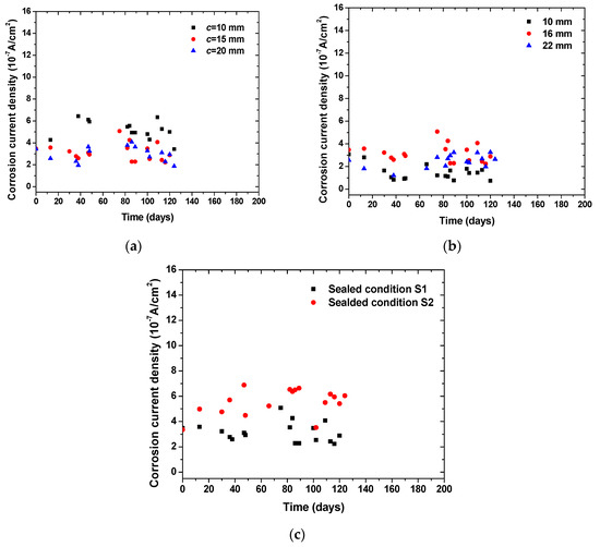 Figure 6 shows the time-dependent evolution of macrocell corrosion current density in concrete specimens with various concrete cover thickness, steel diameters, and sealed conditions. It can be seen that an increase in concrete cover thickness tended to decrease the corrosion rate of steel at the same level of chloride content and anodic potentials. It should be noted that the thickness of concrete cover was increased for the bottom steels (cathode) but not for the top steel (anode). As designed in the specimens, the two bottom steels took oxygen and underwent cathode reaction, while the released electron was transported to the top steel for anode reaction. The reduction in the corrosion rate suggests that the supply of oxygen in the cathode played an important role in the macrocell corrosion reaction. The increase in steel diameter tended to increase the corrosion rate, which is attributed to the enlarged contact surface of steel with concrete. In addition, it can be seen that the specimens sealed with the S2 condition showed a higher corrosion rate than that of the specimens sealed with the S1 condition. As the S2 condition had a higher exposure surface area of concrete to the atmosphere than the S1 condition, this allowed for a high amount of oxygen supply to the cathode. This testing suggests that oxygen supply played a critical role in determining the macrocell corrosion kinetics of steel embedded in concrete.