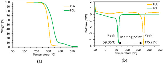 PLA and PCL (a) thermogravimetric analysis (TGA), and (b) differential scanning calorimetry (DSC).