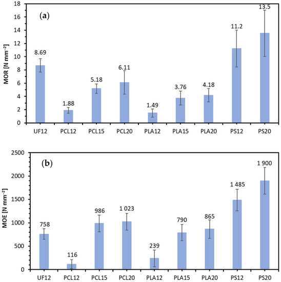 (a) Modulus of rupture (MOR) and (b) modulus of elasticity (MOE) of tested lignocellulosic composites.