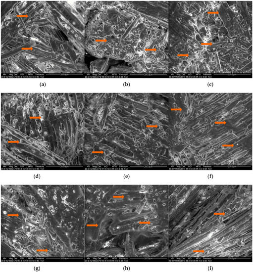 Scanning electron microscope images of lignocellulosic composites with (a) PLA12, (b) PLA15, (c) PLA20, (d) PCL12, (e) PCL15, (f) PCL20, (g) PS12, (h) PS20, (i) UF12; zones covered by binder indicated by arrows.
