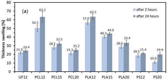 The modulus of rupture (MOR) and modulus of elasticity (MOE) under the three-point bending stress of the investigated panels are presented in Figure 3. As it can be seen, the highest value of MOR (13.5 N mm−2) was found for PS20, while the lowest (1.5 N mm−2) was for PLA12. The reference composite, UF12, has a MOR value at the level of 8.7 N m−2. In the case of MOE, the highest average value was achieved for PS20 (1900 N mm−2) and MOR. The lowest was for PCL12 (116 N mm−2). For PLA12 and PCL12, the average MOE values are significantly different from the remaining average values. There are no statistically significant differences between average MOR values of samples UF12, PCL15, PCL20, PLA15, PLA20. There are also no such differences between both PS composites. It can be seen that for each of the polymers used, the relationship is directly proportional; along with the increase in the resination in the lignocellulosic composite, the average MOR and MOE value also increases. The composites’ 12% resination of biopolymers gives the lowest average values of bending strength and modulus, but just an increase to 15% translates into results comparable to the results for reference composite with UF resin. Regardless of the polymer used as a binder, the highest average strength values are for every panel with 20% resination. The density profiles of composites, except reference (UF12), are flat and uniform along with the board thickness, any change in the bending properties could be attributed to the difference in the composite mean density, as long as the sample does not experience shear failure during the static bending test [47]. According to statistical analysis, there are no significant differences between the average values of the MOR results for PCL15–20, PLA15–20, and between UF and PS binders. When referring to the achieved MOR and MOE results to standard requirements [48] for panels intended to interior fitments (including furniture–P2 type), it should be said that since minimum MOR for panels of thickness 4 mm and above is 12 N mm−2, the only panel meeting this requirement is PS20. The same is for MOE, where standard minimum requirement [48] is 1950 N mm−2.