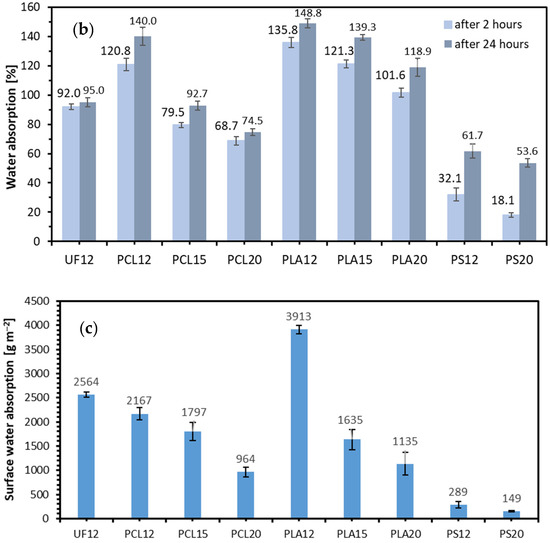 The thickness swelling (TS) and water absorption (WA) after 2 and 24 h average values of lignocellulosic composites are presented in Figure 7. The average TS of the specimens after 2 h of immersion ranged from 10.9% for PS20 to 57.0% for PLA12. After 24 h of immersion, the results were between 19.9% and 63.5%, in the same order as mentioned above. The intensity for TS, calculated as the percentage difference between 2 h TS and 24 h TS, was recorded highest for PLA15 (91.5% of total TS after 2 h), 90% for UF12, while the lowest was for PS20 (54.6%), a paraffin emulsion (or other waxes) is added to the particles during the production of commercially available boards to ensure water resistance under industrial conditions. In the above tests, no hydrophobic agents were used to produce the tested composites. The reference composites use UF resin, intended to be used in dry conditions. It can be appreciated that the TS decreases with the increase in the resination. As with the mechanical properties, it can be seen here that applying a resination level of 15 or 20% gives results with similar average values to composites made with an industrial resin. The 12% of resination of polymers was not enough to obtain results compared to references composites. Referring to the SEM analysis carried out above, it can be confirmed that the increase of resination visibly shows the larger particle surface covered by polymer, which translates into a limited sorption process. WA of the tested composites after 2 and 24 h of immersion in water show a trend consistent with the results of TS. PLA12 had the highest value of WA either after 2 and 24 h, while the lowest obtained PS20. The highest spread between 2 and 24 h, recognized as the lowest intensity of WA, was 29.6% and 35.5% for PS12 and PS20, respectively. The results obtained for TS and WA are confirmed in the conducted surface water absorption (SWA) test (Figure 7). The lowest SWA average value was recorded for PS20 (149 g m−2) and the highest for PLA12 (3913 g m−2), following the same trend as in TS. The low amount of water uptake by samples bonded by PS can be explained by the high contact angle of this binder (PS100), which means weak water spread on the surface (Figure 8).