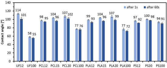 In Figure 8 were presented results of contact angle for all produced lignocellulosic composites, and wider characteristics were measured for pure polymers and UF resin. This test shows that the sessile drop water contact angle is more hydrophobic for every binder with 20% resination. One of the exceptions is UF12, where a similar average contact angle can be observed regardless of the resination level. It was noted that increasing the resination of polymers decreased the porosity of the composite material. Therefore, as the resination increased for both 1 s and 60 s, the average value of the contact angle was higher. The highest contact angle was recorded for UF12, 114° (1 s) and 101° (60 s), the lowest for pure UF resin, 58° (1 s) and 55° (60 s). It is worth adding that the contact angle decreased after 60 s of water droplets remained on the tested surface. These changes were highest for UF12 (10.9% reduction), PCL15, PCL20, PLA15, PLA20—7.4%, 5.1%, 7.4%, 7.4%, respectively. The smallest changes of contact angle after 60 s were found for pure binders: 5.0% for UF100, 1.5% for PCL100, 5.8% for PLA100, and 3.4% for PS100. The above-mentioned high changes of contact angle on the surfaces of wooden composites can be explained by the activity of the microporous surface of wood particles.