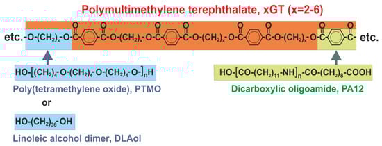 The copolymers were obtained by chemical modification of the poly(multimethylene terephthalate) macromolecule. A certain part of the fragments originating from the terephthalic acid was substituted by the dicarboxylic oligoamide block, and some fragments derived from glycol were replaced by the oligoetherdiol or aliphatic block. The scheme of modification is presented in Figure 1.