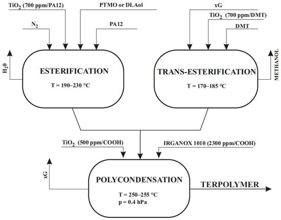 Copolyesters were prepared by the typical melt polycondensation method. The synthesis consisted of two steps with the use of the catalyst. The first stage was the trans-esterification reaction of dimethyl terephthalate (DMT: 2 moles) with glycol (xG: 3 moles) leading to the formation of polyester and the release of methanol (GTGTG + 4CH3OH↑) and the esterification (which was taking place simultaneously in the different reactor) of α,ω-dicarboxylic oligo(laurolactam) (PA12) with oligo(oxytetramethylene)diol (PTMO) or linoleic alcohol dimer (DLAol) (by-product is water). The obtained product is PTMO-b-PA12-b-PTMO + 2H2O↑. From the respective amounts of methanol and water, it was concluded that the conversion ratio in the trans-esterification reaction was 95% and the degree of esterification was 90% (degrees was expressed as the weight ratios of the released methanol or water to the respective stoichiometric amounts of these products). Condensation polymerization of the obtained mixed intermediates was the second step in the preparation process (GTGTG + PTMO-b-PA12-b-PTMO → [PTMO-b-PA12-b-PTMO-b-(GT)x]n + G↑. The titanium catalyst was used in all stages of the synthesis. During the polycondensation, thermal and antioxidant stabilizers were used. Synthesis conditions are presented in Figure 2.