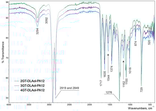 FT-IR spectra of terpolymer xGT-DLAol-PA12 where x = 2, 3 and 4.