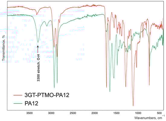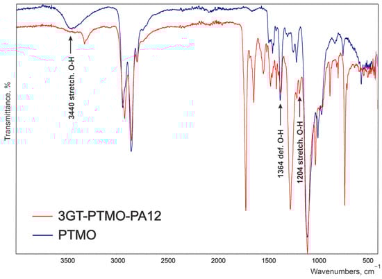 Figure 4 and Figure 5 shows the spectrogram of the obtained ester-b-ether-b-amide (3GT-PTMO-PA12) and PTMO and PA12 homopolymer. There is no large broad adsorption band at the 3440 cm−1 wavenumber on the terpolymer spectrum (Figure 4). A significant reduction in signal intensity at 1364 and 1204 cm−1 can also be observed. The vibrations of the hydroxyl end groups of the polyether are responsible for these bands. The absence of these signals or their significant weakening indicates a decrease in the concentration of end groups and thus the incorporation of the ether block into the terpolymer macromolecule.