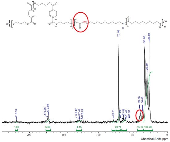 There are no signals originating from the carbon atoms of the carboxyl group in the 13C NMR spectra (Figure 6). The 39.5 ppm chemical shift signal corresponds to an aliphatic–aliphatic ester group. Such a bond can only be formed by reaction of the amide carboxyl end groups with an ester or ether block. Considering the above, it can be concluded that amide was incorporated into the macromolecule of the polymer.