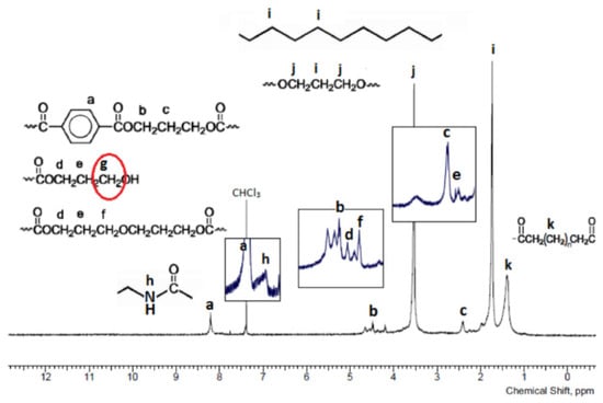The absence of intense signals from the protons of the carboxyl (in the range of 10–13 ppm) and hydroxyl group (the characteristic slim singlet in the 1–5 ppm range) suggests the incorporation of both the amide and ether block in the terpolymer macromolecule. It is important that groups containing acidic protons (such as -OH or -NHCO-) tend to replace their protons with solvent-derived deuterium. As a result, signals from these groups can be significantly blurred or even completely disappear. However, the absence of free hydroxyl groups is confirmed by the lack of signals from the protons of the methylene group connected to the hydroxyl group (designated as ‘g’ in Figure 7).