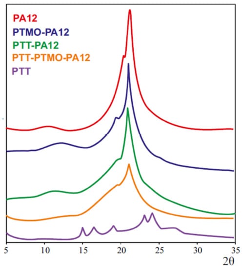 In the high-temperature region (above room temperature), endotherms corresponding to the melting of the crystalline phase can be observed. It is worth noting that in the case of the copolymer PA12-PTT, there is a phenomenon of lowering the temperature below the melting temperatures of both components, the so-called depression of melting points. That indicates a significant defect in the crystal structure of the system. The reduction of Tm relative to the homopolymer can also be observed with the PTT-PTMO copolymer (approximately 30 °C). Most probably, this is due to the previously indicated mutual miscibility of PTT and PTMO blocks. The Tm of the copolymer PA12-PTMO is equal to Tm of the PA12 homopolymer, which again confirms the insolubility of these blocks.