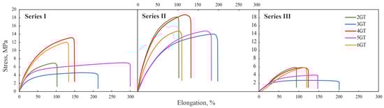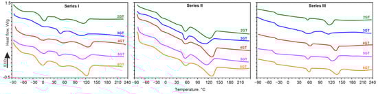 The obtained temperature spectra are typical for thermoplastic elastomers. The spectra of the storage modulus have three temperature regions, in which the courses E′ = t(T) differ significantly. In the temperature region from −100 °C to −70 °C (Series I), −20 °C (Series II) and −30 °C (Series III), the obtained TPEEAs exhibited a constant value of storage modulus above 1 GPa characteristic for the glass state. In the next region, viscoelasticity relaxation processes appear and decrease of modulus was observed. A further increase of temperature caused the occurrence of a wide “plateau” of elastic state, which, above a temperature of 120 °C, terminates by a rapid lowering at the point of crystallite melting of the hard block phase. All terpolymers exhibit broad maxima of damping, and their shape is the result of overlapping of several relaxation transitions relevant to melting, and the glass transition of the amorphous phase and interphase (block mixture occurring at the interface). The shape of these maxima is influenced by dispersion in the amorphous phase of non-crystallizable ester and amide blocks. The xGT-PTMO-PA12 tanδ curves have a broader relaxation peak in contrast to xGT-DLAol-PA12 terpolymers, which have one narrow and high damping peak. Probably, in these terpolymers the interphase is smaller because of good mixing of ester blocks with DLAol matrix (more short ester sequences are in the amorphous phase than in the interphase). Maximum α’ peaks can be observed in terpolymers of series III. This is a result of the relaxation effect of the amorphous phase of PA12 (high content of aliphatic amorphous blocks and their poor mixability with amide blocks causes better phase separation). Within each series, there are no significant changes in the DMTA curves.