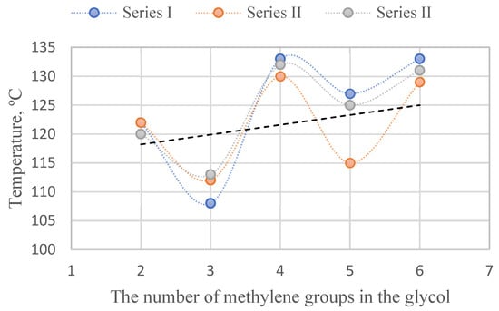 For each of the terpolymers, the phenomenon of depression of the crystalline hard phase’s melting temperature can be observed. This is the result of the dissolution of short ester sequences in PA12 and deterioration of the quality of the crystalline phase, and may also indicate the plasticizing effect of xGT blocks on the hard phase. In addition, a parity rule can also be observed for the whole series (higher melting temperatures of terpolymers with an even number of methylene groups in the glycol from the melting temperature values of both adjacent materials with an odd number of these groups) (Figure 10). Polyesters of even numbered diols exhibit higher melting temperatures than those of odd numbered glycols [,]. The occurrence of the odd-even effect at the melting point of the copolymers may suggest that the TPEs crystalline phase is composed of a mixture of PA12 and xGT blocks.