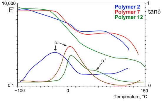 The relaxation behavior of all samples was studied by DMTA, measuring the storage modulus (E′), the loss modulus (E″), and the loss tangent (tanδ). The effect of the temperature on the dynamic mechanical properties of TPE depending on the degree of polymerization of ester block is presented in Figure 11.