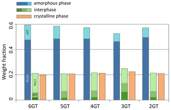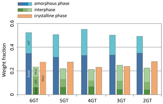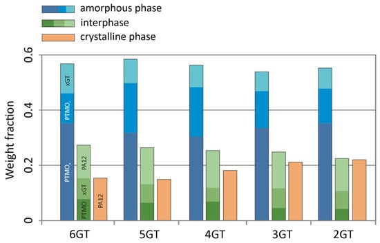 In order to characterize the phase separation of the soft phase and the degree of crystallinity of the hard segment, a DSC analysis was performed. The method also allowed estimation of the size of the interphase and the presence of semicrystalline structures. The DMTA and WAXS techniques were used to confirm original conclusions. With a high degree of probability, the obtained copolymers are characterized by a crystalline-amorphous structure. The amorphous phases (matrix) consist of the flexible blocks PTMO or DLAol, contaminated by short ester chains. The crystalline domains are composed of the hard blocks PA12 and are infused by the xGT blocks. The increase in the number of carbons separating the terephthalate groups in the ester block slightly increases the amount of the amorphous phase in the TPE obtained.