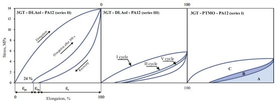 It can be assumed that terpolymers with PTMO matrix have a better elastomeric spatial network capable of transferring high stresses (more interfacial connections). The crystalline TPEEA domains are embedded in a matrix that allows them to move freely and thus return to the original position after releasing the tensile stress. Probably, the interactions at the domain–matrix interface, e.g., by entanglement of the chain, are relatively strong.