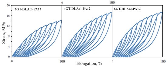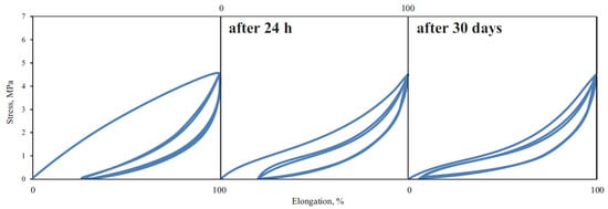 Breaking force, the Young module, elongation at break, and elastic recovery were collected at room temperature with an Instron 5982. These parameters were measured per each sample on ten replicates. Speed of moving clamp was 100 mm/min. Mechanical hysteresis loops of two types were received. The first loop was obtained by stretching terpolymers at constant elongation to 100%. After, elongation specimens were allowed to relax and return to the initial gauge length. The cycle was repeated five times. Based on this measurement, the percent of elastic recovery and permanent deformation of specimens were calculated. The second was received by stretching a polymer from 10% to 100% at elongation growing by 10%. Before testing, all specimens were conditioned without any stress in the standard atmosphere (22 ± 2 °C, 65 ± 5% humidity) for at least 24 h.
