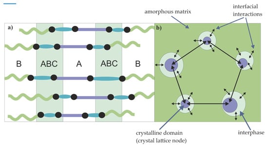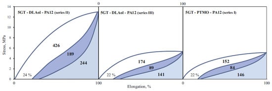 Most likely, the domains move only within the interphase (area between the amorphous matrix and the crystalline domains composed of a mixture of PTT, PA12 and PTMO (or DLAol) blocks), which is anchored in the amorphous matrix (Figure 20). Thus, the more amorphous phase–interphase interfacial interactions occur, the greater the ability of the domains to return to a pre-stress position.