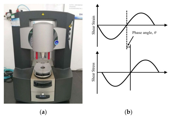The Kinexus ultra+ rotational rheometer produced by Malvern Instruments was used and is shown in Figure 1. The torque range is 3 nN∙m~250 mN∙m. The frequency range is 1 μHz~150 Hz. Its temperature control range is −30 °C~200 °C. The Kinexus rheometer has a large frequency and temperature range, which can be used to study the viscoelastic properties of asphalt binders and asphalt mixtures over large temperature and frequency ranges, respectively.