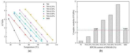 As shown in Figure 2a, the complex modulus decreases exponentially with an increase in temperature. Adding RPCM into the base asphalt binder can potentially improve the high-temperature strength and stiffness of the asphalt binder [23]. However, the deformation resistance of the asphalt binder will still gradually decrease at higher temperatures. As shown in Figure 2b, the complex modulus of HMAB with different RPCM contents is 3.2, 6.1, 11.0, 14.2, and 18.6 times that of the base asphalt binder, respectively, when the experimental temperature is around 70 °C. That is, as theoretically expected, the stiffness is increasing with an increase in the modifier (RPCM) dosage [24].