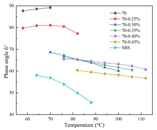 Compared to the base asphalt binder, the SBS-modified asphalt binder shows lower phase angles. This means that the SBS-modified asphalt binder has better recovery ability than the base asphalt binder nor the RCPM modified asphalt binder. For the RPCM modification, in Figure 3, a significant difference in the phase-angle response trends with increasing RPCM content mainly occurs in the temperature range of 70 to 90 °C. This indicates that the structures formed by RPCM in the base asphalt binder dominate the rheological behavior of HMAB and retard or even reverse the growth trends of the phase angle with increasing temperature by increasing the elastic response of HMAB.