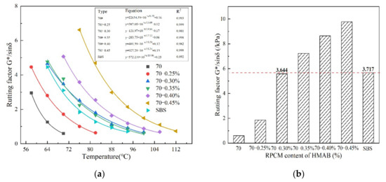 Figure 4b shows a barchart relationship between the rutting factor and RPCM contents of HMAB at 70 °C. From the figure, the rutting factor exhibits a nonlinear increasing with an increase in the RPCM contents at high temperatures. The rutting factors at 0.3% and 0.35% RPCM dosages are 11.2 and 15.1 times that of the base asphalt binder, respectively. Compared to the rutting factors for the SBS-modified asphalt binder, these results suggests that the RPCM content in base asphalt binder should be more than 0.30%—as to achieve enhanced performance that is above the SBS modification.