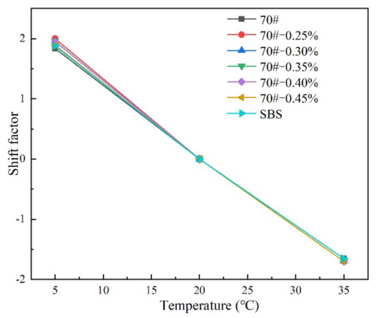 The translation shift factors of all asphalt binder samples were obtained at different temperatures through translation to a reference temperature. The results of this analysis are graphed in Figure 5, with 20 °C used as the reference temperature.
