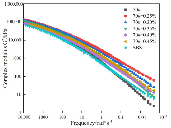A series of frequency sweep tests were performed on the asphalt binder samples to generate master curves of the complex modulus and phase angle, respectively. All the asphalt binder samples were tested in the frequency range of 0.1~100 rad × s−1 at 5, 20, and 35 °C. Ten points for each frequency magnitude, giving a total of 30 frequency points, were selected to check and quantify the extension of the linear viscoelastic domain.