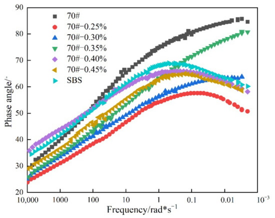 As evident in Figure 7, the phase angle decreased significantly with an increase in both the RPCM content and loading frequency (i.e, shorter loading time). This means that the elasticity of the asphalt binder significantly improved. The base asphalt binder shows the highest phase angle (in magnitude) at the lower frequency range (10−3~102 rad×s−1), which continuously increased as the temperature decreased, with no plateau within the whole range of the frequency sweep.