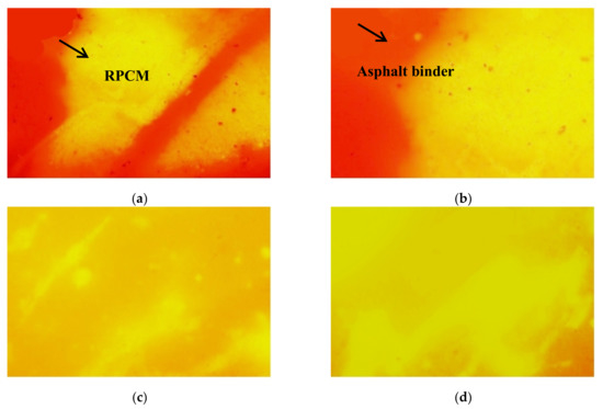 Figure 9 visually shows distinctive changes in the morphology of asphalt binders with an increase in the evolution (developmental) time and it is clearly visible that no fluorescent reaction appears in the base asphalt binder area. The polymer material can display a fluorescent reaction under FM after it swells by absorbing light fractions in the asphalt binder matrix, while the asphalt binder phase cannot exhibit fluorescence [22]. With an increase in the evolution time, the difference between the RPCM and base asphalt binder becomes smaller and gradually form a uniform network distribution in the base asphalt binder. This means that RPCM has good compatibility characteristics with the base asphalt binder.