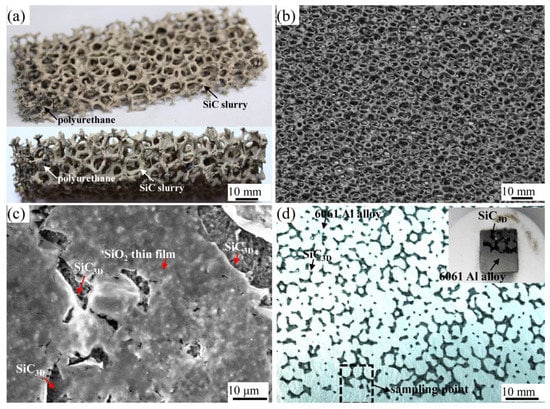 (a) Green SiC3D skeletons; (b) sintered SiC3D skeletons; (c) SiO2 thin film was formed on the SiC3D skeletons; (d) sampling points of SiC3D/6061Al.