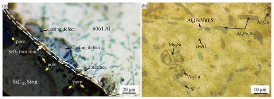 Figure 2a shows a representative optical micrograph (OM) of the T6 heat treatment SiC3D/6061Al. The thickness of 3–5 μm SiO2 layers are found at the interface of the infiltrated SiC3D skeletons’ strengthening phase and Al alloy in Figure 2a, which could effectively prevent direct contact between them and form Al4C3. We did not observe Al4C3 in SiC3D/6061Al composites, indicating that SiC3D cannot decompose to Si and C in a high-temperature environment during low-pressure casting. The surface oxidization of SiC3D can suppress the interfacial reaction and improve the interface bonding strength of SiC3D/6061Al composites. Eutectic Si in a basic hypoeutectic Al–Si microstructure is observed in the Al alloy matrix of SiC3D/6061Al. Secondary dendrite arm spacing (SDAS) with a maximum size of 20 μm was obtained by low-pressure casting and T6 heat treatment. The presence of rod-like and spherical precipitates (second phase particles) was observed in the grain boundaries and interdendritic region of α-Al. The organization at the interface is disordered and has a high entropy value, so it is more susceptible to corrosion. Due to their nano size, the strengthened intermetallic precipitates induced by T6 heat treatment cannot be detected by OM.