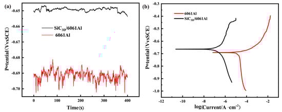 The electrochemical corrosion of SiC3D/6061Al composite includes the metal phase and interface corrosion, and the ceramic phase does not participate in corrosion. Figure 3a describes the OCP and PDP of SiC3D/6061Al and 6061Al in NaCl solution. Table 2 shows the OCP, corrosion potential (Ecorr), and corrosion current density (Icorr) values obtained from the curve in Figure 3. The OCP fluctuation of SiC3D/6061Al composite is smaller than that of 6061Al alloy. In the polarization curve, the SiC3D/6061Al composite shows a larger Ecorr value and a smaller Icorr value than 6061Al, revealing that SiC3D/6061Al composite has better corrosion resistance than 6061Al.