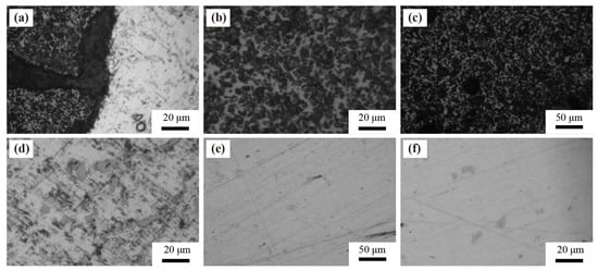 Figure 4 shows the optical micrograph after electrochemical corrosion. More Mg2Si particles were precipitated in the SiC3D/6061Al composite (Figure 4d) than 6061Al alloy (Figure 4f). Cu formed an intermetallic phase with Al that precipitates during solidification either as blocky Al2Cu or as alternating lamellae of α-Al + Al2Cu. Mg was present as Mg2Si in 6061Al alloy for Mg was not in the solution. The corrosion tendency and the sensitivity of early pitting micro-pore nucleation of SiC3D/6061Al is low due to the small potential difference between Mg2Si particles and the 6061Al matrix. Mg2Si particles block the continuity of the matrix in the middle and later stages of corrosion, inhibiting further corrosion [18,19,20,21,22]. Moreover, the second phase precipitation reduces the pitting nucleation sensitivity of the SiC3D/6061Al, inhibits the corrosion tendency, and increases the corrosion potential. It is worth noting that an anti-corrosion, anti-oxidation network macrostructure with advantages of large interface recombination, few concentrated interfaces, and the small specific area is formed in SiC3D/6061Al. Thus, the corrosion resistance of SiC3D/6061Al is higher than that of 6061Al alloy.