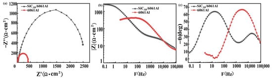 Figure 5 shows the EIS of SiC3D/6061Al and 6061Al without salt spray corrosion. The Nyquist diagrams of the two materials are both capacitive reactance diagrams (Figure 5a). The impedance spectrum is shown as a capacitive reactance arc in the high-frequency region, reflecting the corrosion electrochemical reaction on the electrode surface. The actual shrinking tail appears in the low-frequency area, which the adsorption of the reaction may cause intermediate products at the electrode surface [23,24]. The Nyquist diagram in Figure 5a is a semicircle; thus, the control steps of the electrode process are determined by the electrochemical reaction step (charge transfer process). The impedance caused by the diffusion process can be ignored. Figure 5b,c show the Bode diagram has two time constants. Compared to 6061Al, the impedance modulus of SiC3D/6061Al is higher in the early stage of corrosion, lower in the middle stage, and slightly higher in the later stage. The phase angle of SiC3D/6061Al is higher than that of the 6061Al alloy in the early stage. However, it is lower than that of the 6061Al alloy in the middle and late stages. EIS results of the SiC3D/6061Al and 6061Al are consistent with the PDP results in Figure 3.