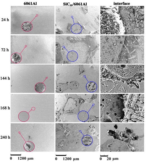 After 168 h, 6061Al alloy changed from pitting to uniform corrosion, and deep cracks appeared at the interface of the SiC3D/6061Al composite.