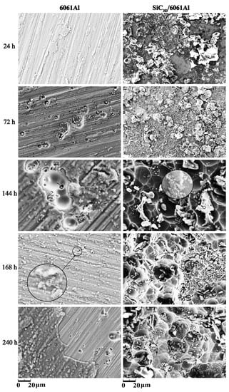 The corrosion degree of SiC3D/6061Al and 6061Al alloy gradually reduces at extended times, as shown by periodic NSS tests. The corrosion process combines pitting corrosion and intergranular corrosion and eventually develops into exfoliation corrosion [23,24,25]. Figure 6 shows the surface morphology of the SiC3D/6061Al and 6061Al samples corroded in NSS tests. In order to observe the fine structure of corrosion degree of the 6061Al alloy and the metallic phase of SiC3D/6061Al composite, the metal phases of the two materials were zoomed.