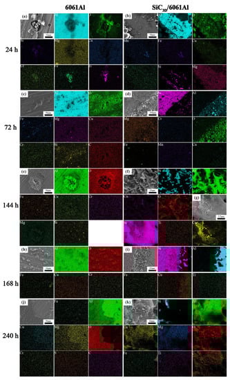 Energy dispersive X-ray spectrometer (EDS) of corrosion products with different times after NSS corrosion. (a,c,e,h,j) 6061Al; (b,d,f,g,i,k) SiC3D/6061Al.