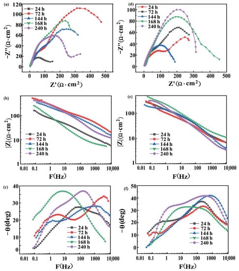 EIS of SiC3D/6061Al (a–c) and EIS of 6061Al alloy (d–f) after NSS at different times: (a,d) Nyquist diagram; (b,e) Bode diagram (|Z|-F); (c, f) Bode diagram (−θ-F).