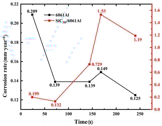 The CR of two materials vs. NSS time in Figure 10 shows the CR according to weight loss after NSS tests of 6061Al is lower than that of SiC3D/6061Al and the weight loss is less than that in SiC3D/6061Al, which is consistent with the corrosion morphology and the law of weight loss per unit area. The CR decreased from 0.209 to 0.134 mm/year for 6061Al alloy. However, a constant increase was observed during the 24 and 48 h, with a maximum value of 1.53 mm/year at 168 h of NSS tests. After this time, we recorded a decrease in the CR, at 240 h of NSS tests, reaching values of 1.19 mm/year for SiC3D/6061Al. The result indicates that the addition of a skeleton structure of SiC3D results in an increase of CR of 6061Al alloy.