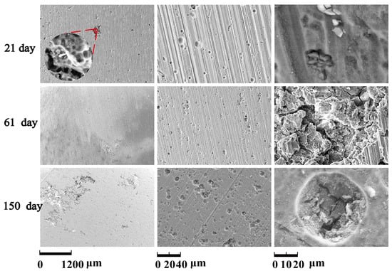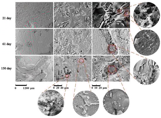 The salt leaching (SL) tests simulated the marine environment, using 3.5 wt %, pH 6.6 neutral NaCl solution for immersion, the test period was 21, 61, and 150 days, the test temperature was (25 ± 2) °C, and after immersion corrosion, the method of removing corrosion products was the same as NSS and used Zeiss GeminiSEM 300 to determine the corrosion products and observe the corrosion morphology.