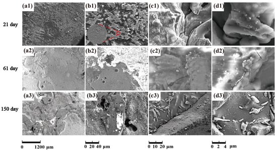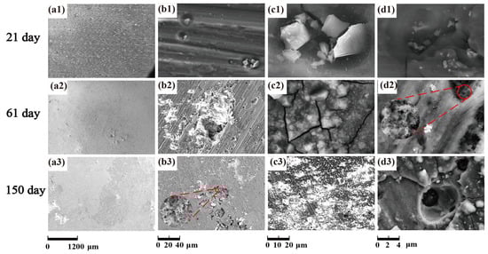 Corrosion product morphology of 6061Al alloy. (a1–a3) Corrosion morphology of 6061Al with low magnification; (b1–b3) Corrosion morphology of the interface of 6061Al with low magnification; (c1–c3) Corrosion morphology of 6061Al with higher magnification; (d1–d3) Corrosion morphology of 6061Al with the highest magnification.