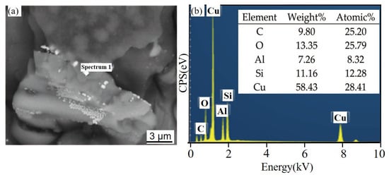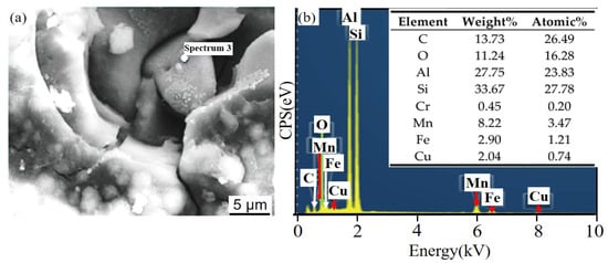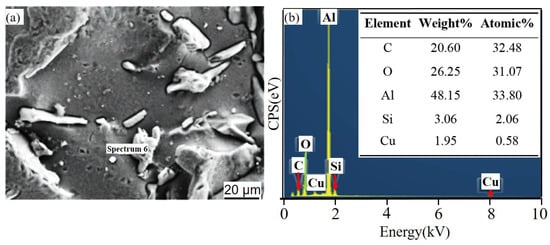 EDS of particles in the corrosion pit of SiC3D/6061Al after SL for 21 days. (a) SEM image of particles in the corrosion pit; (b) EDS of particle.
